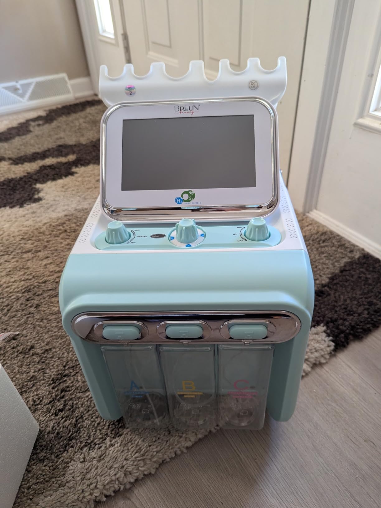 3. Doe de oplossing in de ABC-flessen en doe zuiver water in de D-fles. 4. Sluit de stroomkabel aan op het stopcontact en zet het apparaat aan.