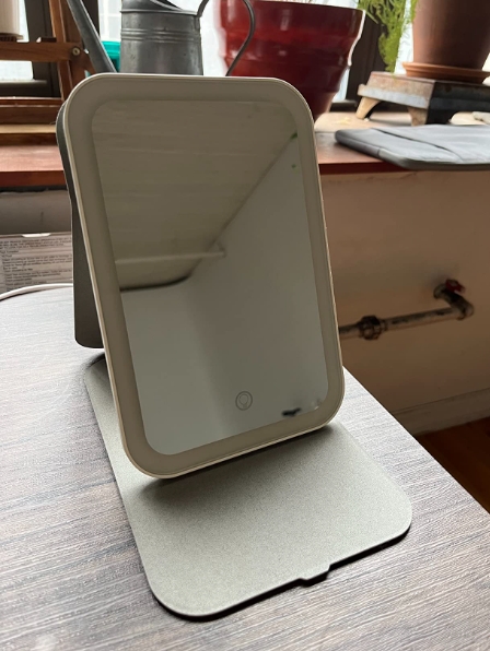 Deze LED-lichtspiegel is een geweldig formaat om in je aktetas of handbagage te gooien. Groot genoeg voor functionaliteit en klein genoeg om niet omvangrijk of lastig te dragen te zijn. De verschillende kleurinstellingen zijn erg handig om de juiste look voor mijn make-up te krijgen, en de intensiteitsvariabiliteit van het licht wordt ook gewaardeerd. Oplaadbare batterij zorgt voor langdurig gebruik, de prijs waard, ik ben er dol op.