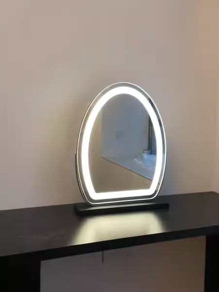 Het is prachtig en de perfecte maat voor mijn gewone kaptafel. Hij draait zodat ik comfortabel kan zitten en make-up kan opdoen. De verlichting is mooi, niet superhelder, maar oké.